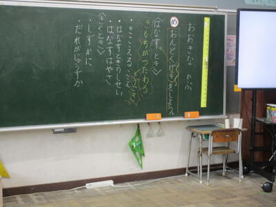 1・2時間目の外国語の時間にこれまで練習してきた【おおきなかぶ】の英語劇を1年生に見せました。1年生はちょう