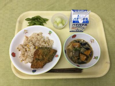 献立:牛乳 コーン茶飯 万鯛の磯部揚げ 南瓜と茄子のそぼろ煮 ゆで枝豆 ずんだ餅(宮城県)