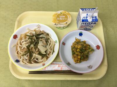 献立:牛乳 うどん 冷やしきつねの具 とうもろこしのかき揚げ 梨ゼリー