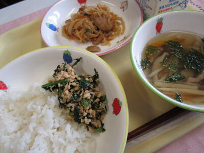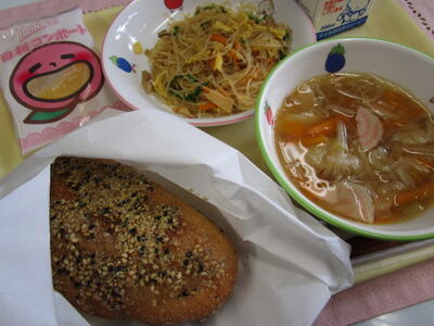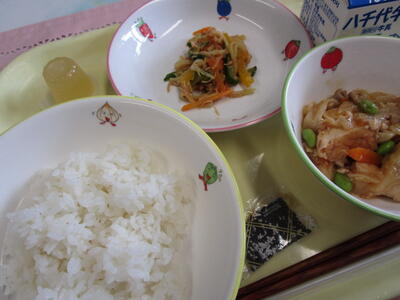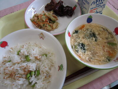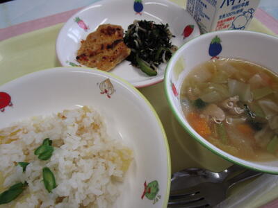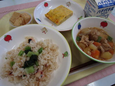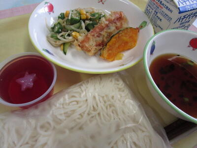 今日は七夕です。天の川に見たてたそうめん、星に見たてたオクラ、ゼリーには星型のナタデココを入れた七夕献立です。