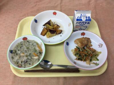 献立:牛乳 七草雑炊 鶏肉の照り焼き 蒲鉾和え 大学芋