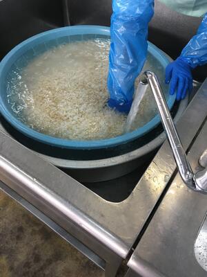 雑炊のとろみをなるべくなくすため、炊いたご飯を一度洗ってもらい、でんぷん質を落として調理しました。