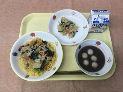 献立:牛乳 あんかけ焼きそば 棒棒鶏 白玉汁粉