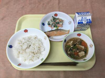 献立:牛乳 ごはん 鮭の柚庵焼き 胡麻白和え 生揚げと野菜の旨煮