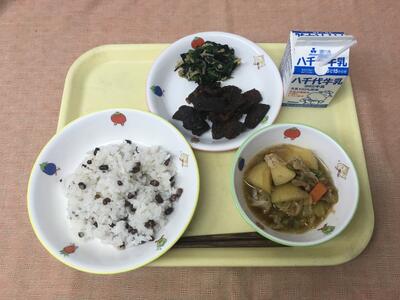 献立:牛乳 小豆ごはん 甘辛ケチャップレバー ほうれん草の磯和え 肉じゃが