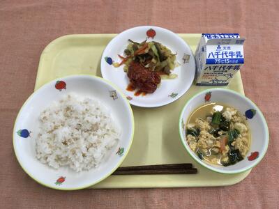 献立:牛乳 ごはん ヤンニョムチキン 海藻金平炒め クッパ