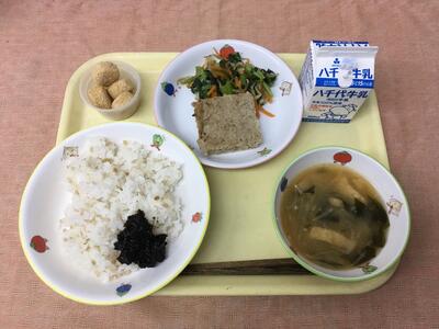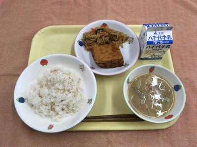 献立:牛乳 ごはん 生揚げの甘辛焼き 切干大根の含め煮 ごま味噌汁