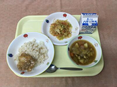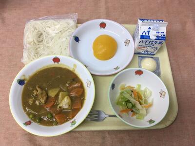 献立:牛乳 ソフト麺 カレーソース キャベツの甘酢あえ 桜桃 型抜きチーズ