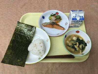 献立:牛乳 おにぎり 鮭の塩焼き 蕪の浅漬け ほうれん草の味噌汁