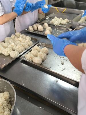 給食室では調理員さんが一生懸命全校分のおにぎりをにぎってくれました。