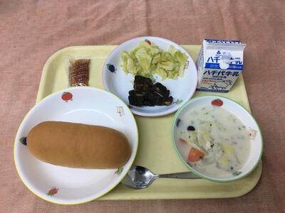 献立:牛乳 コッペパン いちごジャム クジラの竜田揚げ キャベツのソテー 白菜の豆乳クリームスープ