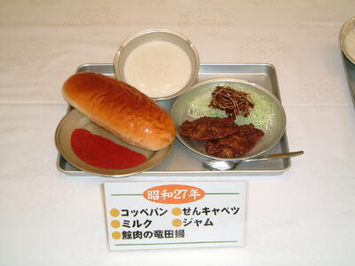 それまでは、小麦粉を使ったパン給食が基本でした。また、高価だった肉に代わり、クジラが使われました。