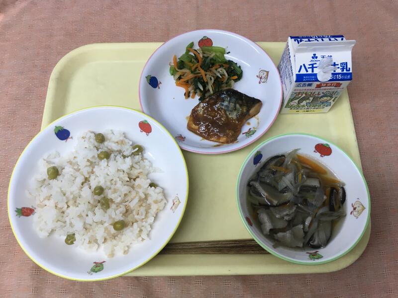 献立:牛乳 ピースごはん 鯖の味噌煮 小松菜のおひたし 沢煮椀