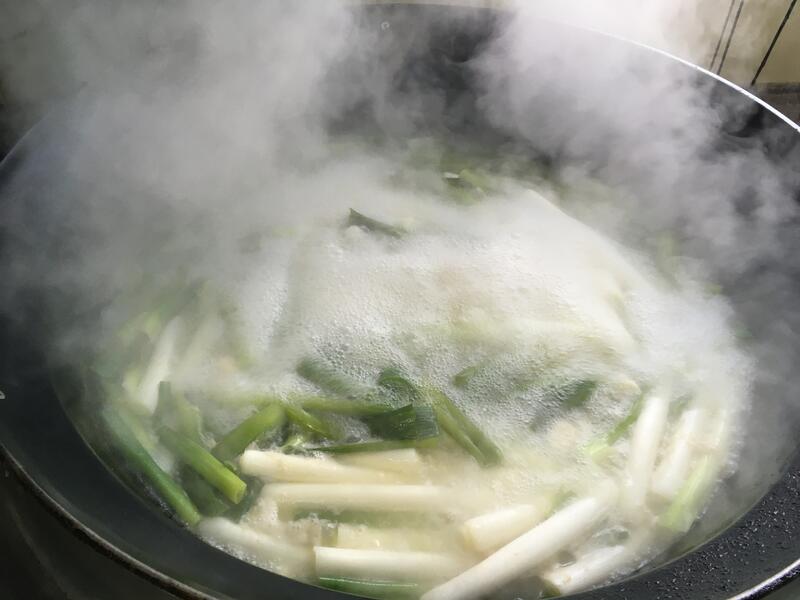 チャーシューのゆで汁に、ネギやにんにく、しょうがを入れて香りと旨味を入れます。