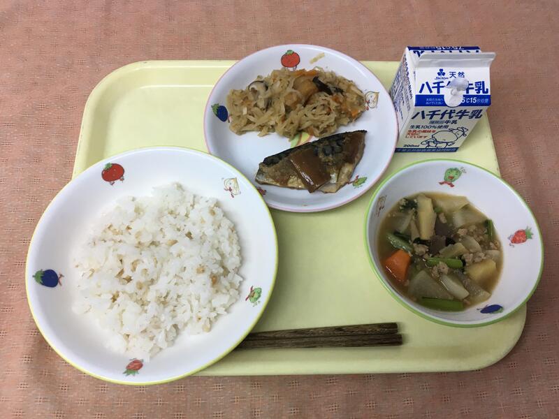 献立:牛乳 ごはん 鯖の生姜煮 切干大根の含め煮 蕪のそぼろ煮
