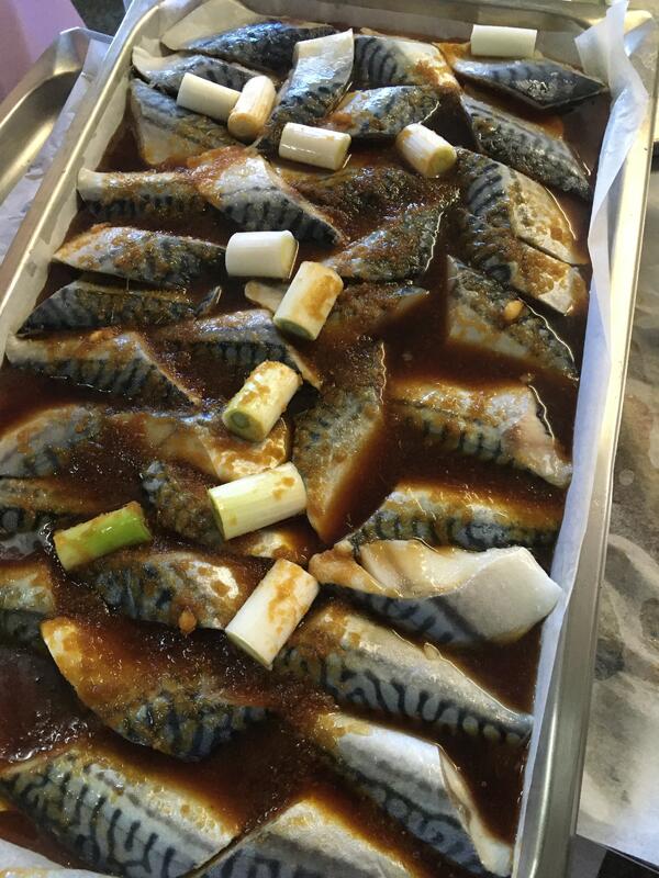 今日の、鯖の生姜煮は鍋ではなく、オーブンを使って煮ました。食べやすくするために大量の生姜を使い、甘辛い味付けにしました。また、オーブンで煮た後のタレをさらに鍋で煮詰めてかけました。味は美味しいけど、やはり骨に苦手意識があり、食べるのを躊躇している子も見られました。