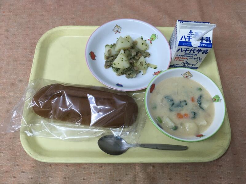 献立:牛乳 黒糖パン ジャーマンポテト 豆乳シチュー