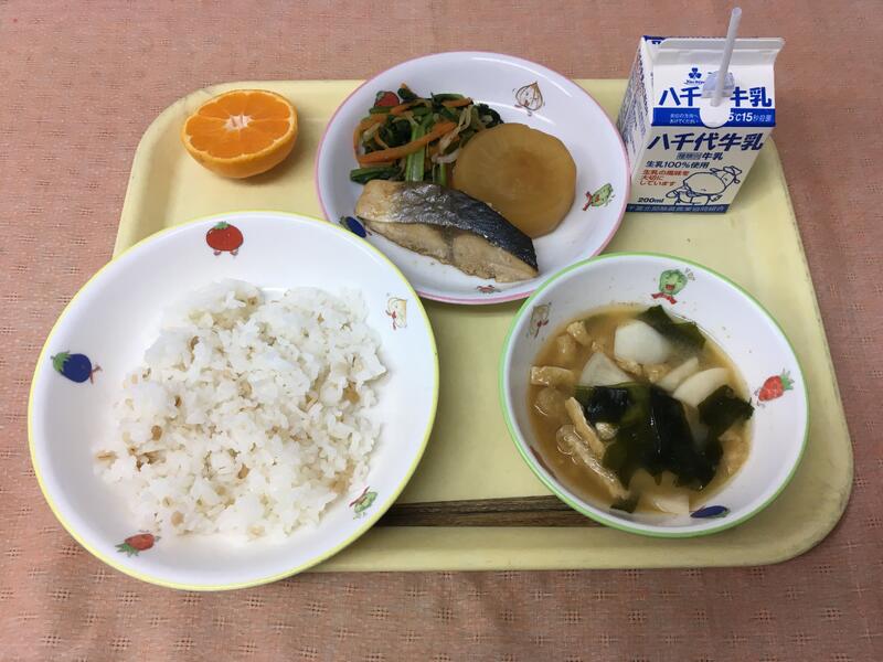 献立:牛乳 ごはん ぶり大根 小松菜のおひたし 蕪の味噌汁 みかん