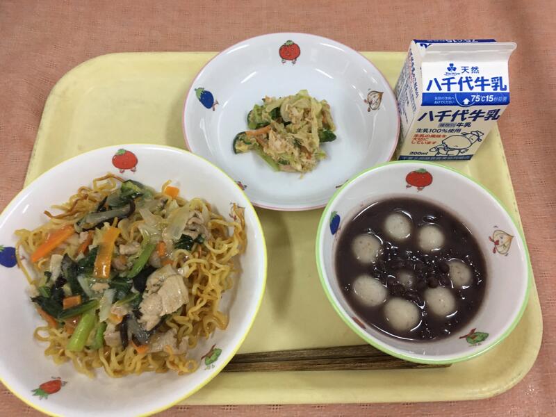 献立:牛乳 あんかけ焼きそば 棒棒鶏 白玉汁粉