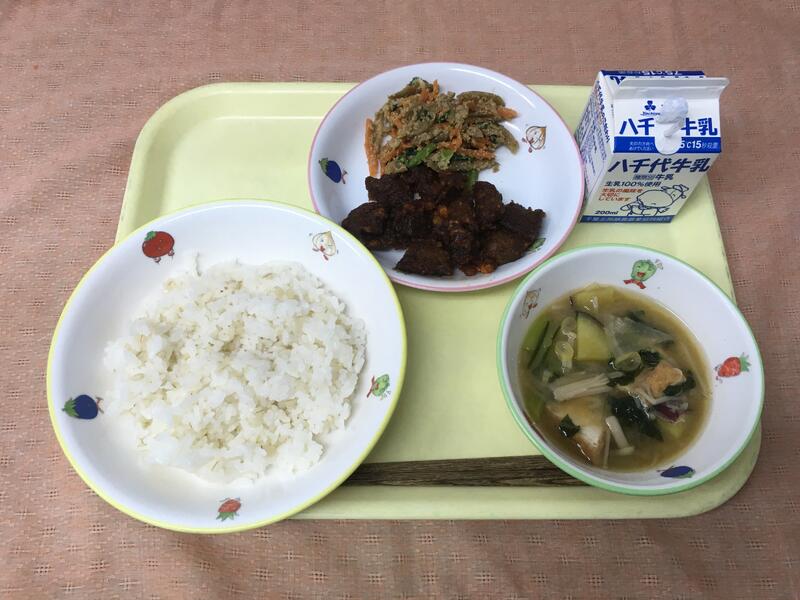 献立:牛乳 ごはん 甘辛ケチャップレバー ごぼうの胡麻和え さつまいもの味噌汁