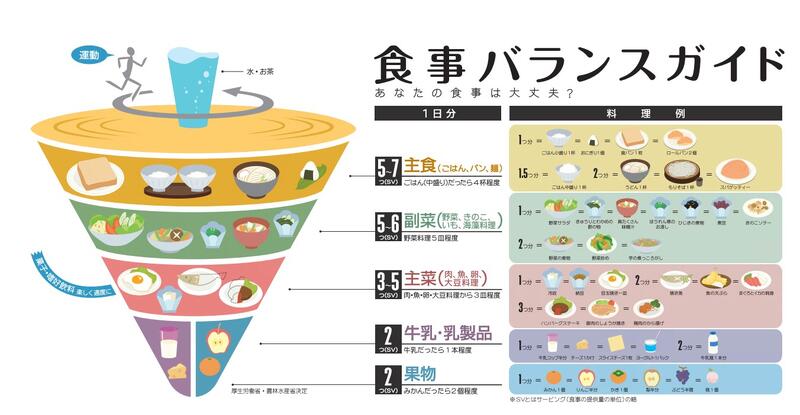 厚生労働省の出している一日分の目安となる食事量になります。下記リンクだと年齢や普段の活動量ごとに何をどれくらい摂ったらよいかというガイドになっています。