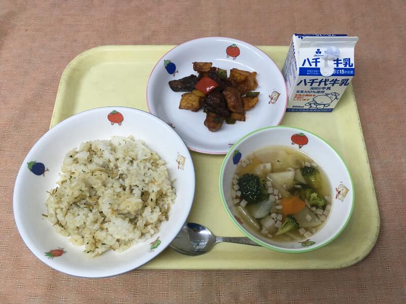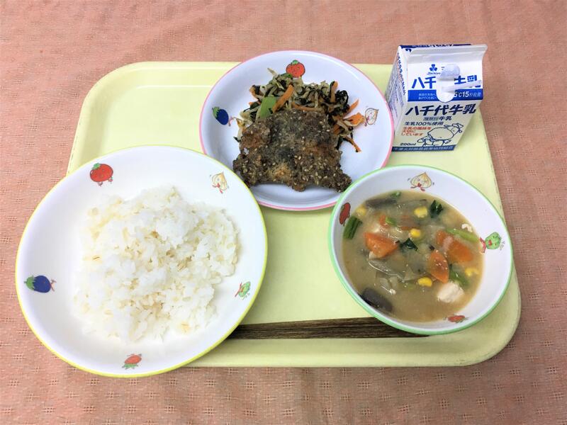 献立:牛乳 ごはん 豚肉の赤紫蘇揚げ 海苔おかか和え 石狩汁(北海道)