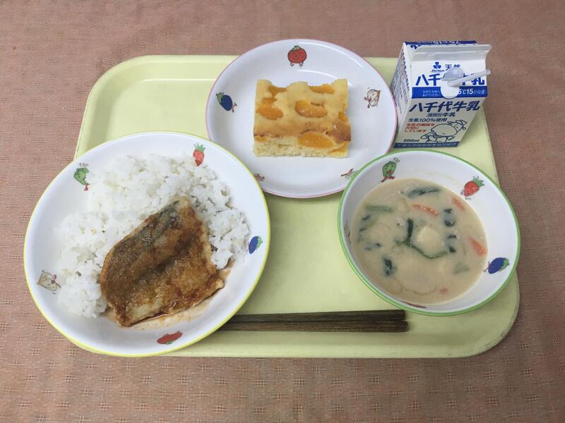 献立:牛乳 ごはん 鱈の甘酢ソースがけ 呉汁 みかんケーキ