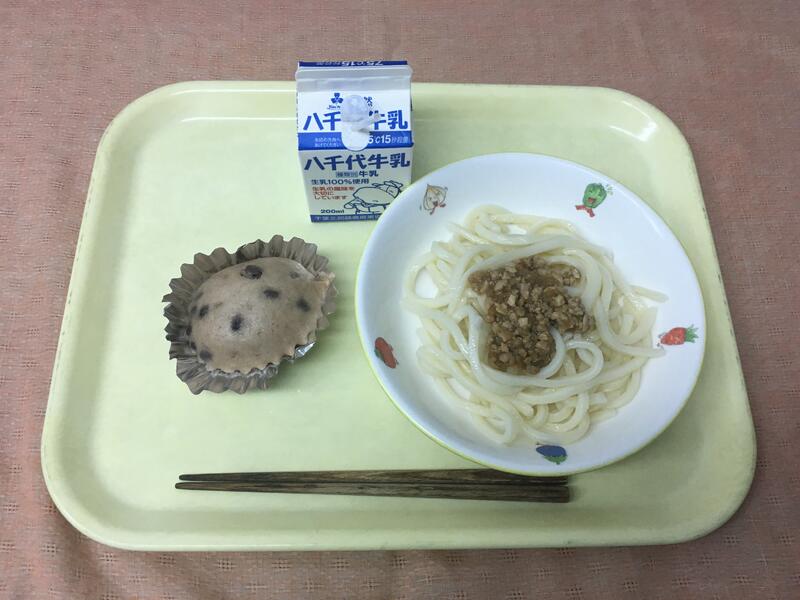献立:牛乳 肉みそうどん 小豆蒸しパン