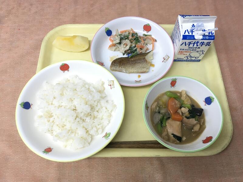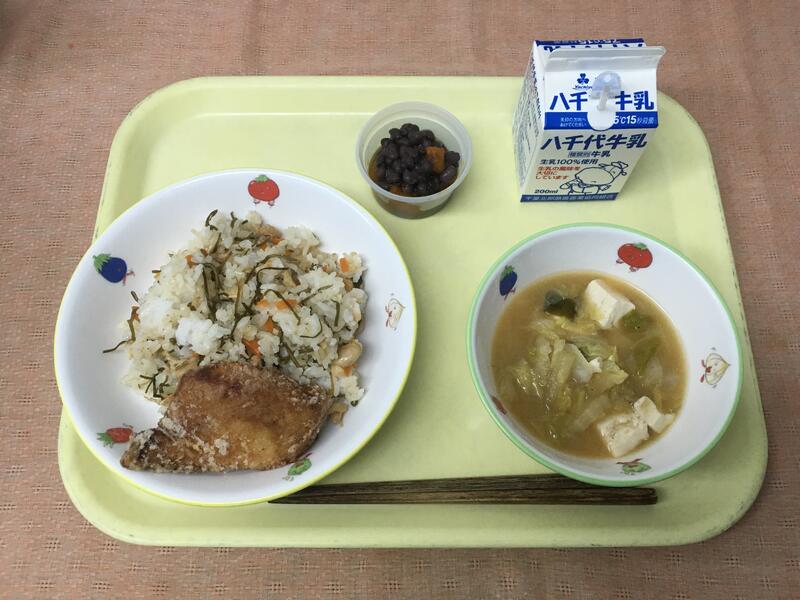献立:牛乳 昆布ごはん 万鯛の竜田揚げ 白菜の味噌汁 かぼちゃのいとこ煮(茨城県)