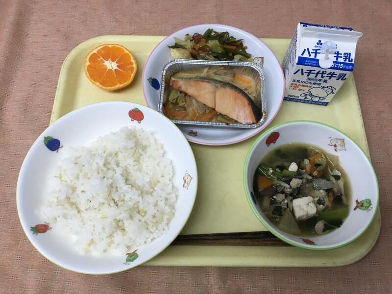 献立:牛乳 ごはん 鮭のちゃんちゃん焼き(北海道) 茎わかめのサラダ けんちん汁 みかん