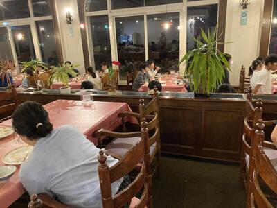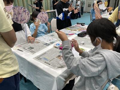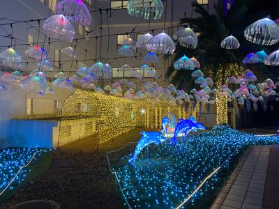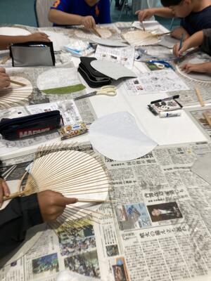 ホテルでは房州うちわづくりに取り組みました。難しい作業でしたが、教えていただきながら自分が選んだ紙で素敵な房州うちわを完成することができました。夕食は、楽しく歓談しながら食べました。ホテルはイルミネーションがとても綺麗です。