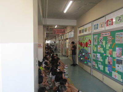 1階、2階の教室から3階に避難する訓練です。3棟に分かれているのでそれぞれの棟でスムーズに