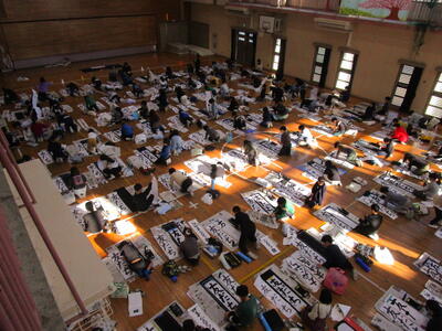 今日は3、4年生が体育館で書初めの練習をしました。