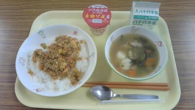 今日の給食(ツナと卵のそぼろ丼、白玉汁、ヨーグルト)