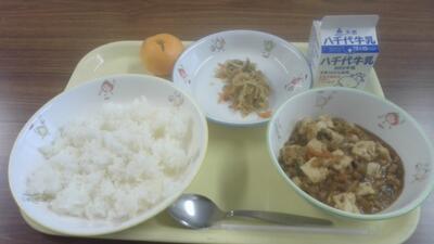 今日の給食(マーボー豆腐、もやしときゅうりのごま風味、みかん)