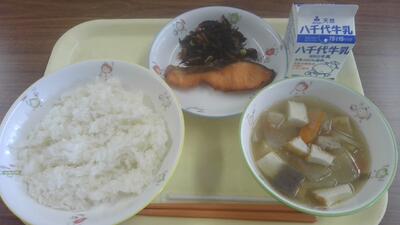 今日の給食(鮭の香味みそ焼き、ひじきの梅煮、のっぺい汁)