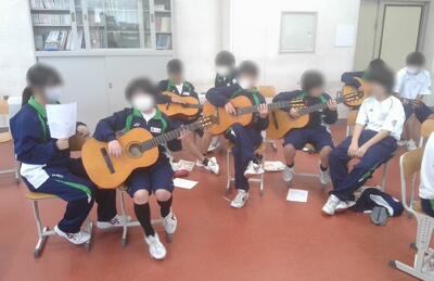 1年生の音楽では、ギターの練習をしていました。演奏しやすい「かえるのうた」から始まり、今後は「カントリーロード」が演奏できるように授業を行っていきます。
