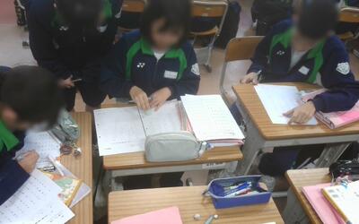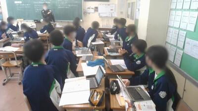 3年生の社会科は、公民の授業で「国民の政治参加を増やすためにはどうしたらよいかを考えよう」の学習目標のもと、個別にタブレットなどを使用して調査し、グループに分かれて自分の意見を発表していました。「SNSをもっと利用したほうがいい」や「オンライン投票の導入」「投票所の雰囲気を変える」「褒美や罰を与える」など様々な意見が出ていました。最後に、班ごとにどんな意見が出てきたかを、クラス全員で共有していました。