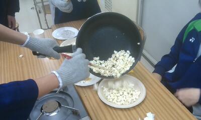 葦の渚学級では、家庭科の授業でポップコーンづくりにチャレンジしていました。甘くて香ばしい香りが教室中に広がっていました。