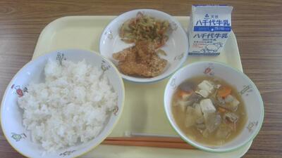 今日の給食(チキンたれかつ、キャベツのおかか和え、豚汁)
