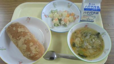 今日の給食(きな粉揚げパン、肉団子スープ、マセドアンサラダ)