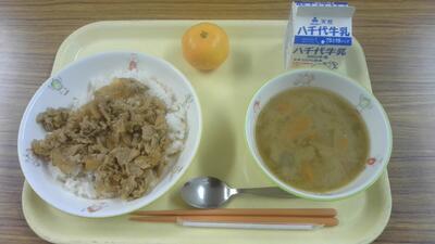 今日の給食(豚肉丼、さつま汁、みかん)
