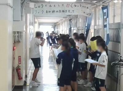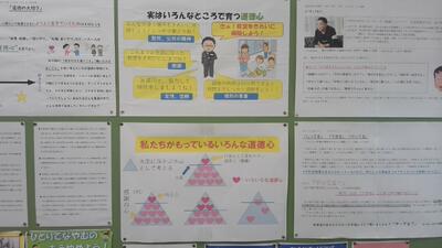 1年生の廊下には、道徳心について分かりやすく説明された掲示物がありました。福栄中ではどの学年もローテーション道徳を行い、毎回クラスの担当者を変えて行っています。多くの意見や感想を聞いて考えを深めています。