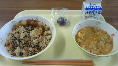 今日の給食(栗ご飯、魚のもみじ焼き、ごぼうのカレー金平、白玉汁)