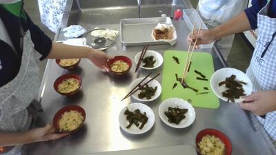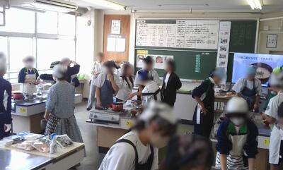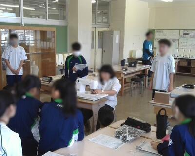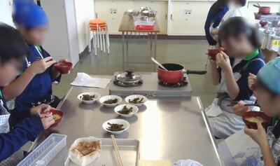 2年生の家庭科の授業では、だしの取り方を学んでいました。廊下にも漂うだし汁の香り。昆布と鰹節を使って、ときたま汁を作り、試食しました。かぐわしい香りとは裏腹に、「味が薄い」「醤油が足りない」等、感想を伝え合っていました。家でも安全に挑戦してみてください。
