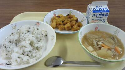 今日の給食(ごまとわかめのご飯、鶏肉とサツマイモの甘辛炒め、 豚汁)