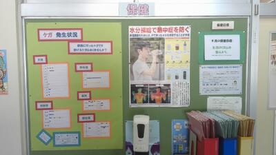 保健室前は、月の保健目標や時期に合わせたポスター、その月に発生したけがの状況がわかる表などが掲示されています。