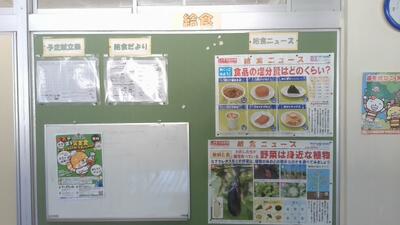 保健室のもう一方の壁は、給食関係のコーナーです。献立表や給食便り、給食ニュースが掲示されています。