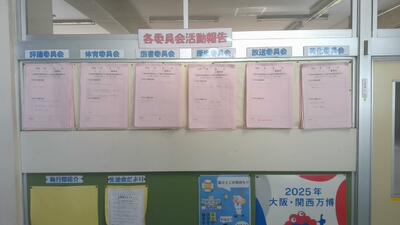 会議室の壁は、生徒会からのお知らせが中心です。専門委員会の月目標や活動内容などが報告が掲示されています。