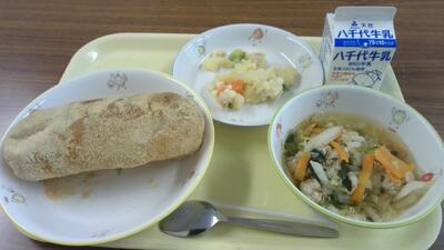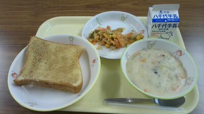 今日の給食(セサミトースト、アサリの米粉シチュー、メキシカンサラダ)